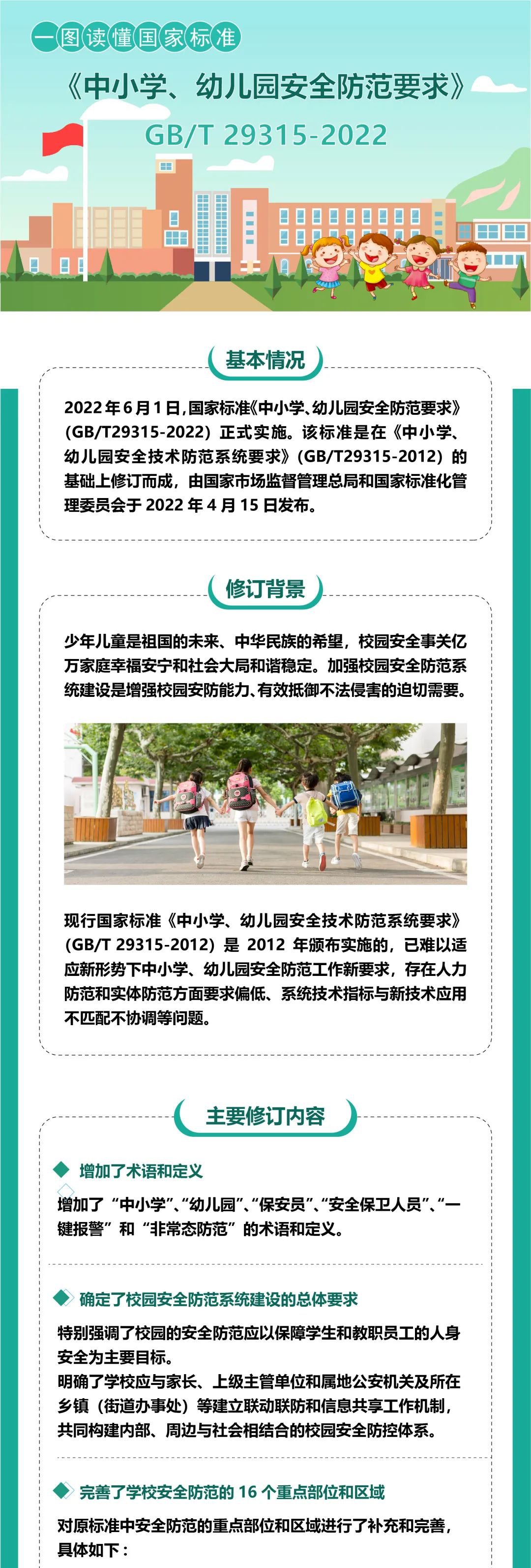 《中小學(xué)、幼兒園安全防范要求》(GB/T 29315-2022)(以下簡(jiǎn)稱(chēng)《要求》)近日經(jīng)市場(chǎng)監(jiān)管總局(標(biāo)準(zhǔn)委)批準(zhǔn)發(fā)布,將于2022年6月1日起正式實(shí)施。這是2012年原《中小學(xué)、幼兒園安全技術(shù)防范系統(tǒng)要求》(GB/T 29315-2012)發(fā)布后首次修訂。