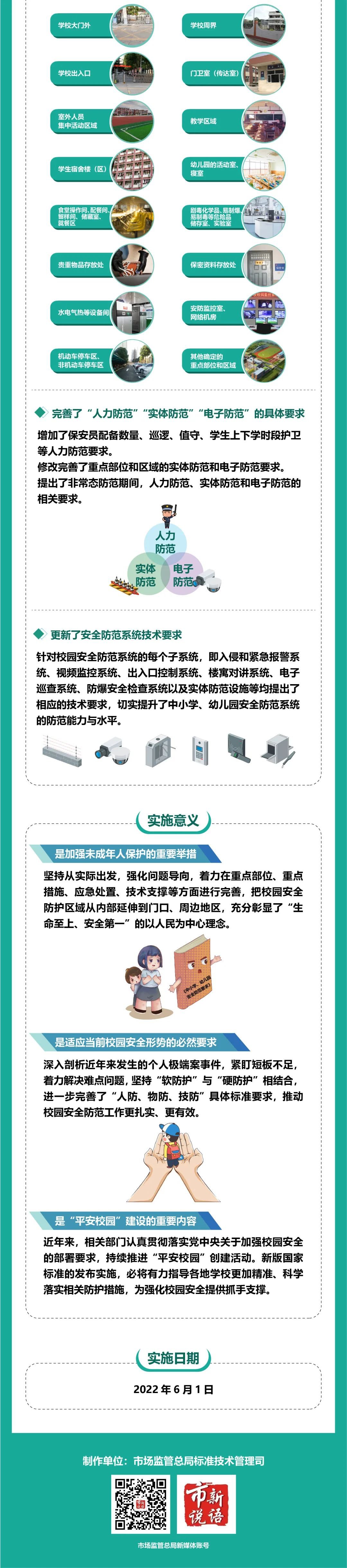 《要求》是認(rèn)真貫徹落實(shí)習(xí)近平總書(shū)記關(guān)于進(jìn)一步加強(qiáng)校園、社會(huì)少年兒童安全防護(hù)工作重要指示精神的具體實(shí)踐,是貫徹落實(shí)黨中央關(guān)于未成年人保護(hù)方面決策部署的重要舉措。新《要求》的發(fā)布與實(shí)施,彌補(bǔ)了2012版《中小學(xué)、幼兒園安全技術(shù)防范系統(tǒng)要求》人力防范和實(shí)體防范方面要求偏低、系統(tǒng)技術(shù)指標(biāo)與新技術(shù)應(yīng)用不匹配不協(xié)調(diào)等問(wèn)題。對(duì)于進(jìn)一步完善校園安全防范工作規(guī)范體系具有重要意義。《要求》修訂遵循“實(shí)用可行、科學(xué)先進(jìn)、適度超前”的指導(dǎo)原則,以體現(xiàn)校園安全“人防、物防、技防相結(jié)合”為重點(diǎn),保障學(xué)生和教職員工的人身安全為主要目標(biāo),從實(shí)際出發(fā),強(qiáng)化問(wèn)題導(dǎo)向,著力在重點(diǎn)部位、重要措施、應(yīng)急處置、技術(shù)支撐等方面完善相關(guān)內(nèi)容與技術(shù)規(guī)范,提升學(xué)校安全防范水平。《要求》的核心內(nèi)容包括“重點(diǎn)部位和區(qū)域”“總體防范要求”“人力防范要求”“實(shí)體防范要求”“電子防范要求”和“安全防范系統(tǒng)技術(shù)要求”等,適用于中小學(xué)和幼兒園安全防范系統(tǒng)的建設(shè)和管理,其他未成年人集中教育培訓(xùn)、救助保護(hù)等機(jī)構(gòu)或場(chǎng)所安全防范系統(tǒng)的建設(shè)與管理可參照?qǐng)?zhí)行。《要求》的突出亮點(diǎn)是,明確安全防范的重點(diǎn)部位和區(qū)域。堅(jiān)持以“生命至上、安全第一”為中心理念,結(jié)合近年來(lái)國(guó)家和相關(guān)部門(mén)對(duì)中小學(xué)、幼兒園安全防護(hù)工作的系列部署以及校園的不同類(lèi)型、規(guī)模,明確了安全防范的16個(gè)重點(diǎn)部位和區(qū)域,把校園安全防護(hù)區(qū)域從內(nèi)部延伸到了門(mén)口、周邊地區(qū)。《要求》的鮮明特征是,體現(xiàn)校園安全“人防、物防、技防相結(jié)合”,融入安全防范新技術(shù)、新理念,提升標(biāo)準(zhǔn)可操作性。對(duì)重點(diǎn)部位和區(qū)域的防范措施、系統(tǒng)技術(shù)要求作出了詳細(xì)的規(guī)定,推動(dòng)校園安全防范工作更扎實(shí)、更有效,保障系統(tǒng)技術(shù)指標(biāo)與新技術(shù)應(yīng)用相匹配、相協(xié)調(diào)。