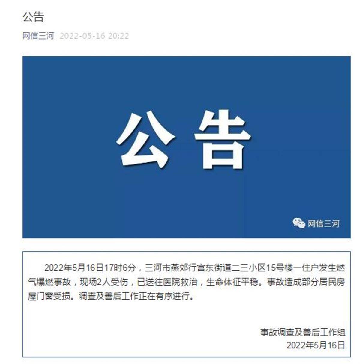 上個月當地曾發生燃氣爆炸事故(圖源:網信三河微信公眾號截圖)