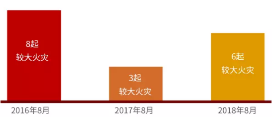 8月共發生6起較大火災,比去年同期增加3起,是近5年來同期較大火災較多的月份,僅次于2016年同期的8起;8月也是今年繼1月、4月和5月后,第四個較大火災上升的月份。8月發生1起重大火災,8月25日,黑龍江省哈爾濱市北龍溫泉休閑酒店因電氣原因引發火災,亡20人、傷23人,系近3年來傷亡人數最多的火災。