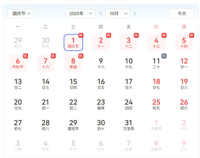 放假時間10月1日至10月8日,共放假8天。10月9日正常上班,9月28日補班。由于節假日期間停止發貨,為減少影響,請做好備貨安排。放假期間正常電話值班,節后發貨,有需要可及時咨詢;