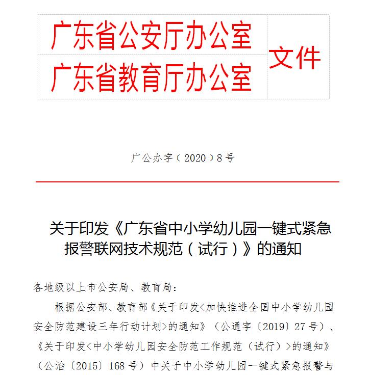 文件還公布了 廣東省中小學(xué)幼兒園一鍵式緊急報(bào)警聯(lián)網(wǎng)技術(shù)規(guī)范(試行)