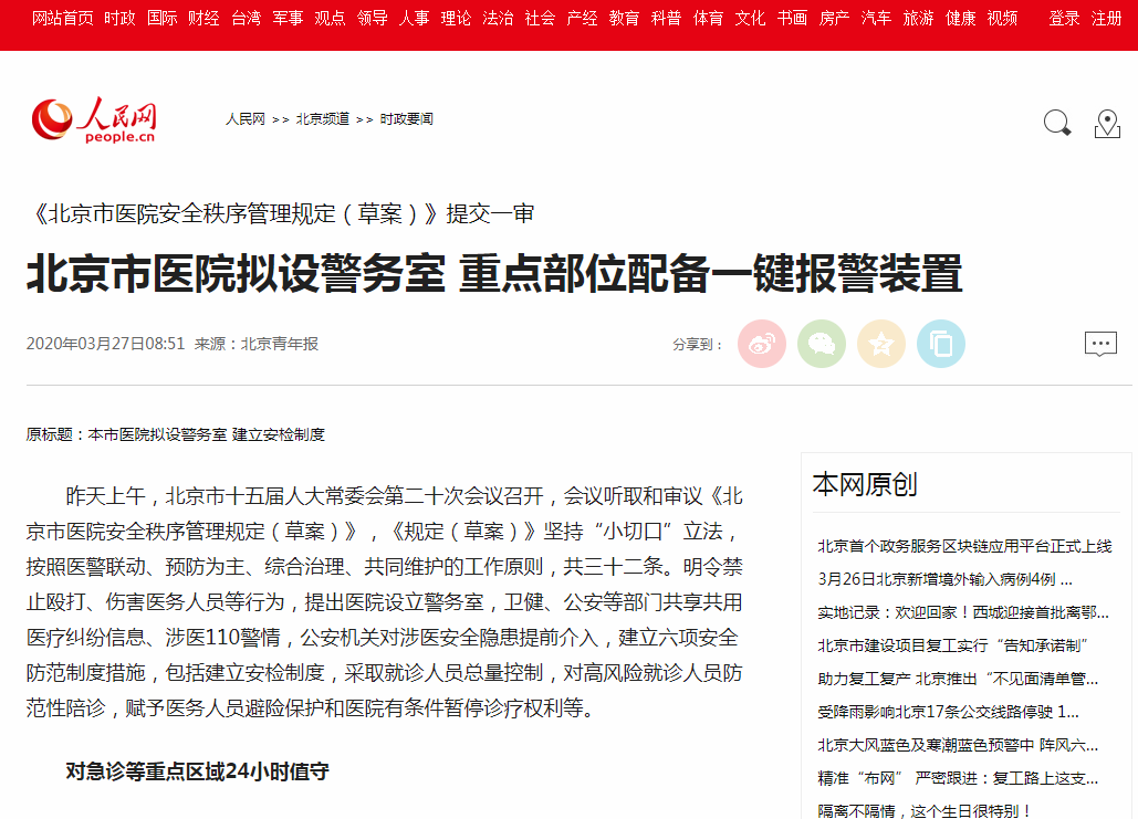 昨天上午,北京市十五屆人大常委會第二十次會議召開,會議聽取和審議《北京市醫院安全秩序管理規定(草案)》,《規定(草案)》堅持“小切口”立法,按照醫警聯動、預防為主、綜合治理、共同維護的工作原則,共三十二條。明令禁止毆打、傷害醫務人員等行為,提出醫院設立警務室,衛健、公安等部門共享共用醫療糾紛信息、涉醫110警情,公安機關對涉醫安全隱患提前介入,建立六項安全防范制度措施,包括建立安檢制度,采取就診人員總量控制,對高風險就診人員防范性陪診,賦予醫務人員避險保護和醫院有條件暫停診療權利等。