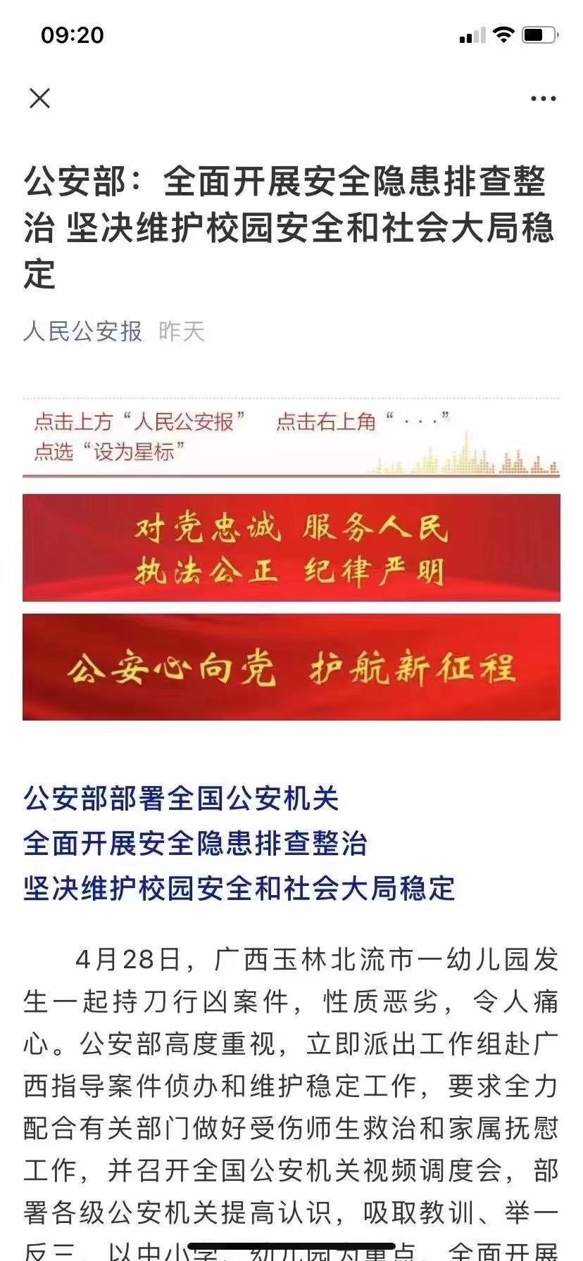 4月28日,廣西玉林北流市一幼兒園發(fā)生一起持刀行兇案件,性質(zhì)惡劣,令人痛心。公安部高度重視,立即派出工作組赴廣西指導(dǎo)案件偵辦和維護(hù)穩(wěn)定工作,要求全力配合有關(guān)部門做好受傷師生救治和家屬撫慰工作,并召開全國(guó)公安機(jī)關(guān)視頻調(diào)度會(huì),部署各級(jí)公安機(jī)關(guān)提高認(rèn)識(shí),吸取教訓(xùn),舉一反三,以中小學(xué)、幼兒園為重點(diǎn),全面開展一次安全隱患大排查大整治,采取有力措施加強(qiáng)中小學(xué)、幼兒園安保工作和社會(huì)面巡邏防控,堅(jiān)決維護(hù)校園師生安全和社會(huì)大局穩(wěn)定。
