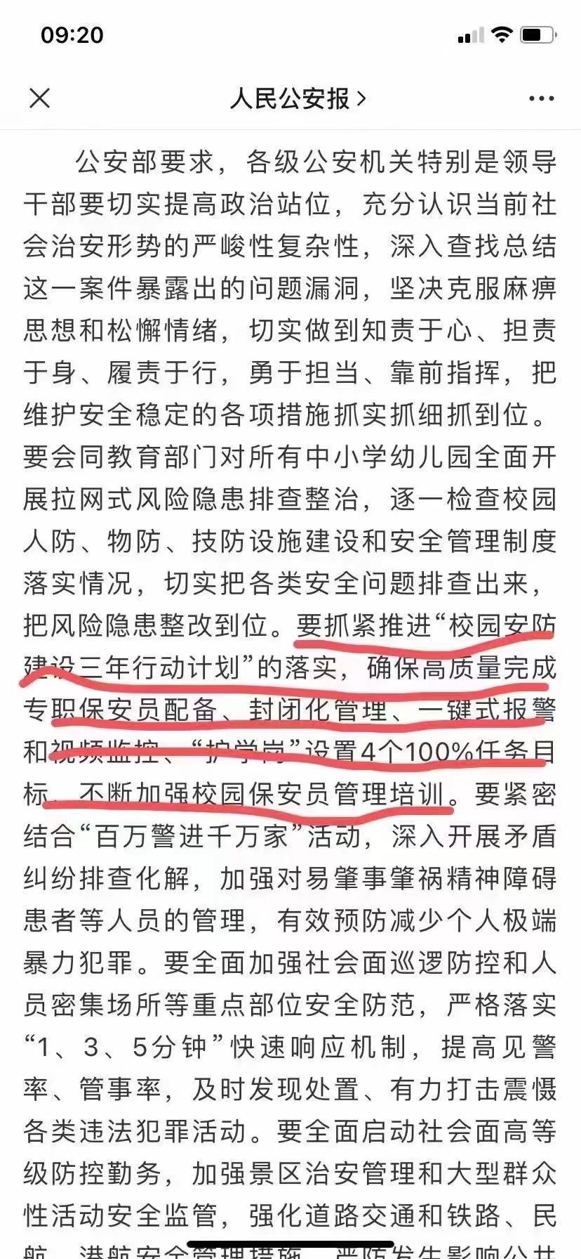 公安部要求,各級(jí)公安機(jī)關(guān)特別是領(lǐng)導(dǎo)干部要切實(shí)提高政治站位,充分認(rèn)識(shí)當(dāng)前社會(huì)治安形勢(shì)的嚴(yán)峻性復(fù)雜性,深入查找總結(jié)這一案件暴露出的問題漏洞,堅(jiān)決克服麻痹思想和松懈情緒,切實(shí)做到知責(zé)于心、擔(dān)責(zé)于身、履責(zé)于行,勇于擔(dān)當(dāng)、靠前指揮,把維護(hù)安全穩(wěn)定的各項(xiàng)措施抓實(shí)抓細(xì)抓到位。要會(huì)同教育部門對(duì)所有中小學(xué)幼兒園全面開展拉網(wǎng)式風(fēng)險(xiǎn)隱患排查整治,逐一檢查校園人防、物防、技防設(shè)施建設(shè)和安全管理制度落實(shí)情況,切實(shí)把各類安全問題排查出來(lái),把風(fēng)險(xiǎn)隱患整改到位。要抓緊推進(jìn)“校園安防建設(shè)三年行動(dòng)計(jì)劃”的落實(shí),