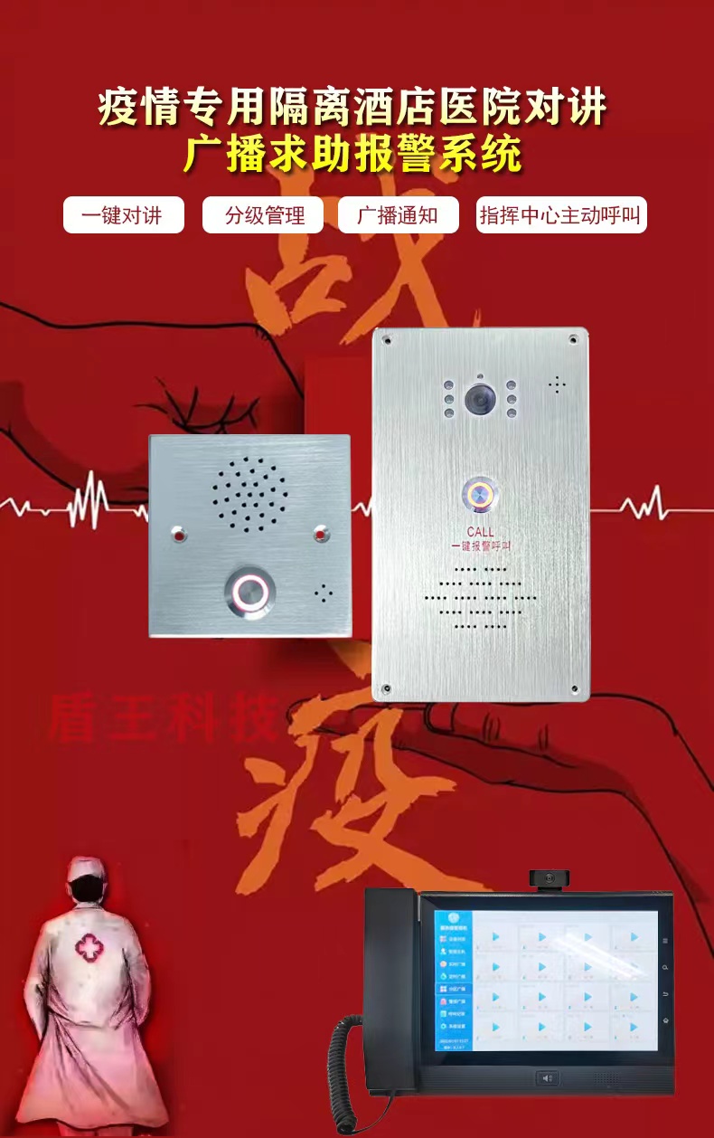 盾王方艙醫院、隔離酒店、居家隔離86盒IP語音對講系統,此產品86盒大小,不占空間,對講方便,可以隨時呼叫中心,跟中心進行語音交互,可以及時上報身體情況及體溫,同時中心也可以隨時呼叫任意房間人員,也可以同時呼叫多個房間人員,可以對單個或所有人員進行通知廣播,進行疫情宣傳廣播。此產品問世,解決病情防控人與人不能近距離通話交流的難題。