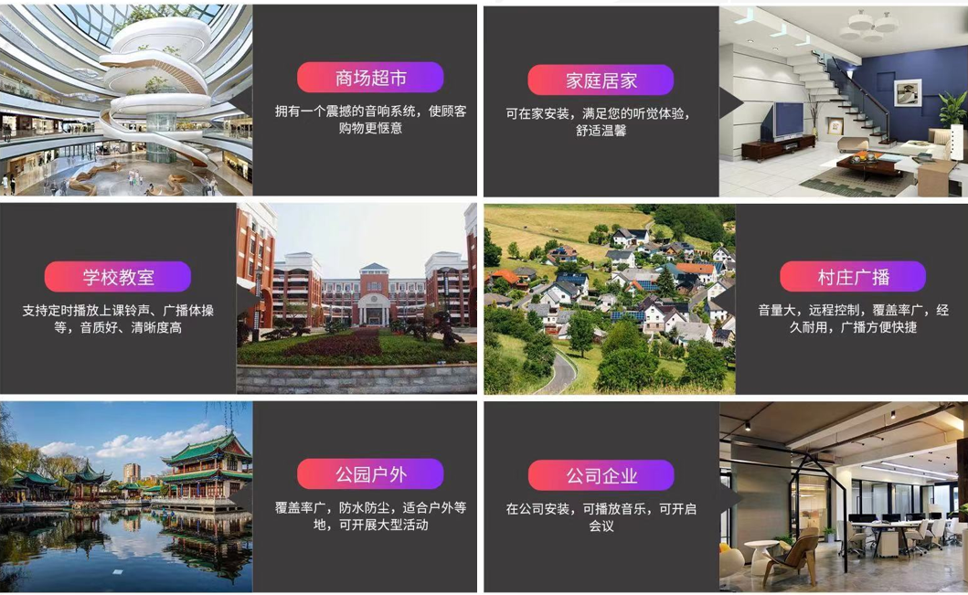 通過互聯(lián)網(wǎng)/廣域網(wǎng)組網(wǎng)的IP廣播系統(tǒng)。改變傳統(tǒng)局域網(wǎng)組網(wǎng)方式,音頻導(dǎo)入方便快捷,分級分權(quán)限管理 ,聯(lián)動球機(jī)高清視頻、錄音錄像、電子地圖顯示、廣播喊話等功能,適用于商場超市,學(xué)校教室,公園戶外,車站,碼頭,智慧路燈,村莊廣播 ,公司企業(yè),無人值守停車場等場地應(yīng)用。
