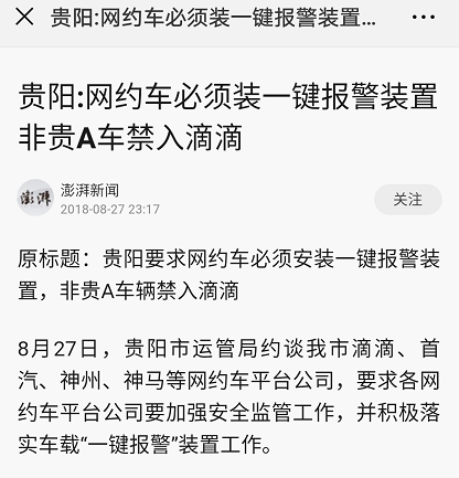8月27日,貴陽市運管局約談滴滴、首氣、神州、神馬等網約車平臺公司,要求網約車平臺公司加強安全監管工作,并積極落實車載“一鍵報警”裝置工作...