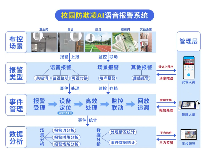 多維度保護:該系統不僅關注顯性的肢體沖突,還關注語言暴力和網絡欺凌等隱形問題,通過語音識別和文本分析,全面覆蓋校園內的各種交互場景,確保學生在各個角落都能得到保護。