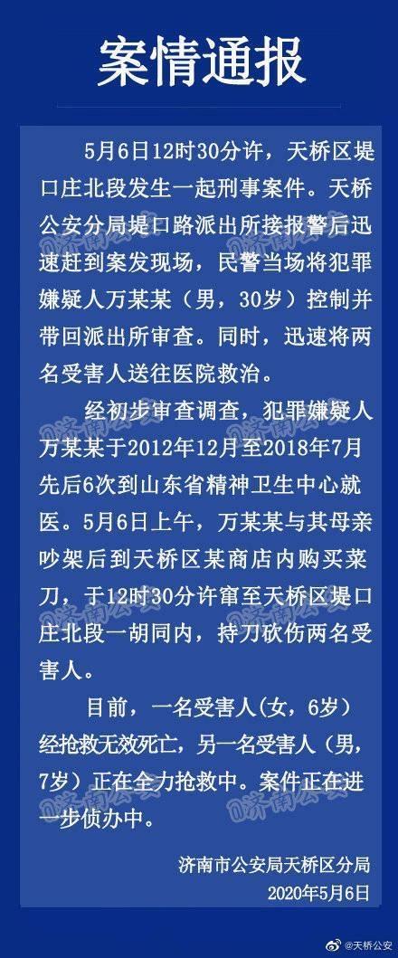 濟南市公安局天橋區分局官方微博5月6日消息,就濟南兩名兒童被陌生男子持刀襲擊發布警情通報,具體如下: