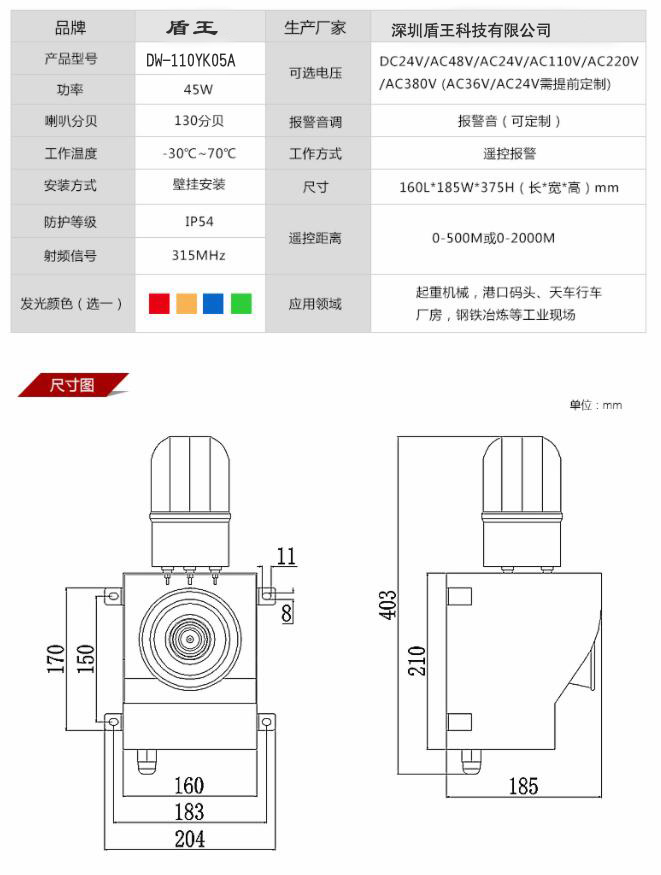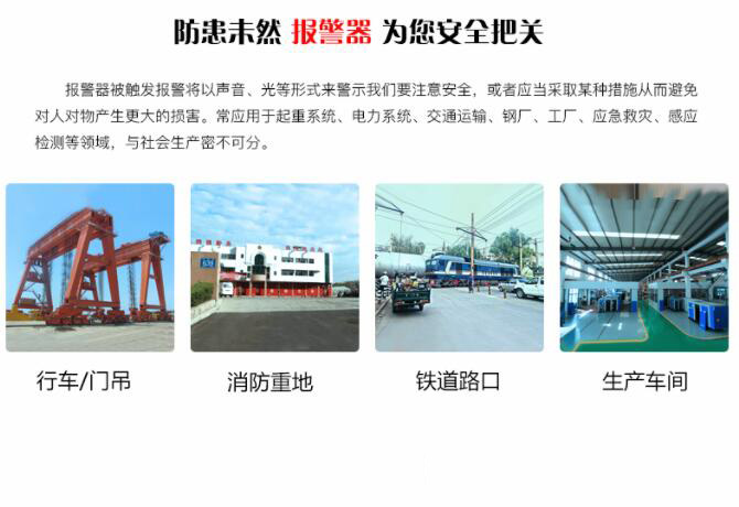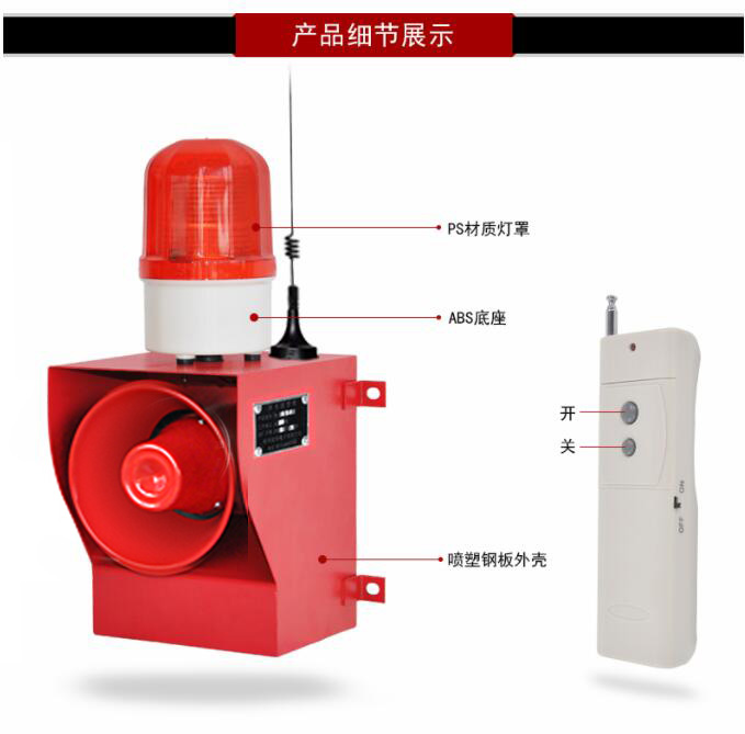 遙控一鍵聲光報警器,產品內芯采用專用集成電路設計具有抗干擾能力強,工作穩定等特點;外型利用噴塑鋼板材料,采用先進的工藝制作而成,結構設計新穎、美觀、大方;閃光燈利用目前流行的LED燈管制造而成,大大增強了燈管的使用壽命;同時本系列產品還具有重量輕、防水、抗強震、安裝方便等優點。產品系列型號齊全,用戶可根據自身使用場合及要求選擇音調及語音報警方式。該型號適用于噪雜的工業現場或較空曠的礦上等場所。適用于起重機械、門吊、橋吊、行車以及冶金、礦山大型的安全警報裝置。大功率遙控聲光報警器用戶可根據自身使用場合及要求選擇電壓,音調及語音報警方式等。YS-05AY無線遙控聲光報警器系列是我公司采用了聲光控制技術,該款聲光報警器內置315MHZ無線模塊,可使用出廠標配的無線遙控器遠距離遙控聲光報警器的“開”與“關”,真正做到隨開隨關,遠程無線控制!
