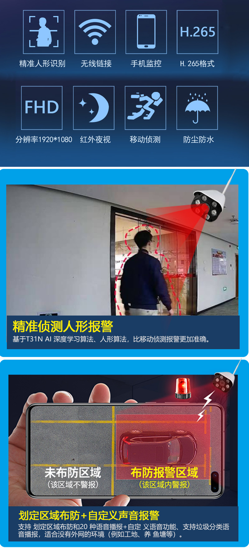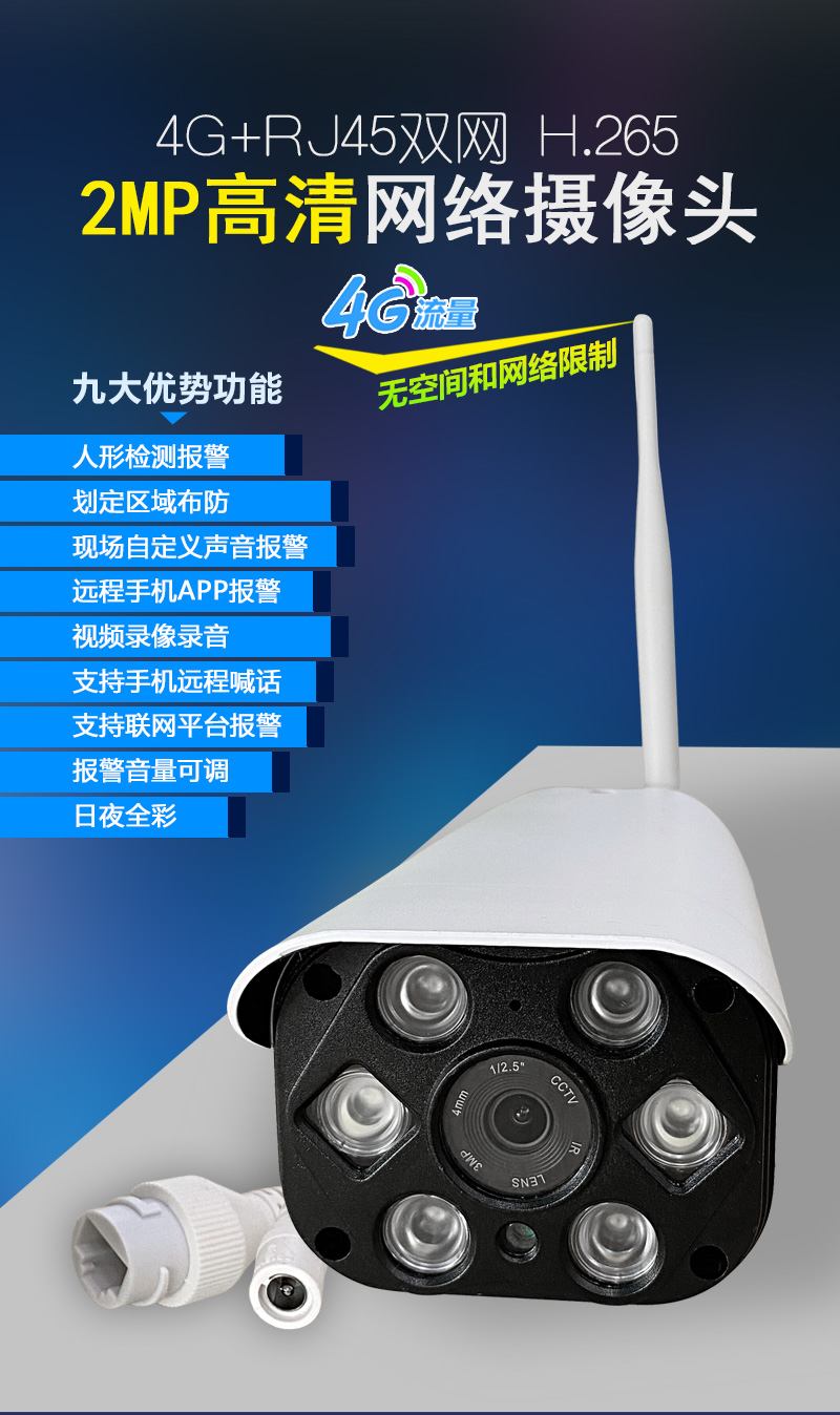 • 功能描述:4G無線高清攝像頭監控報警攝像機采用4G無線網絡通訊,支持人形識別報警、移動偵測報警、劃區域報警,支持現場報警和手機報警,能通過手機APP設置報警聲音等功能